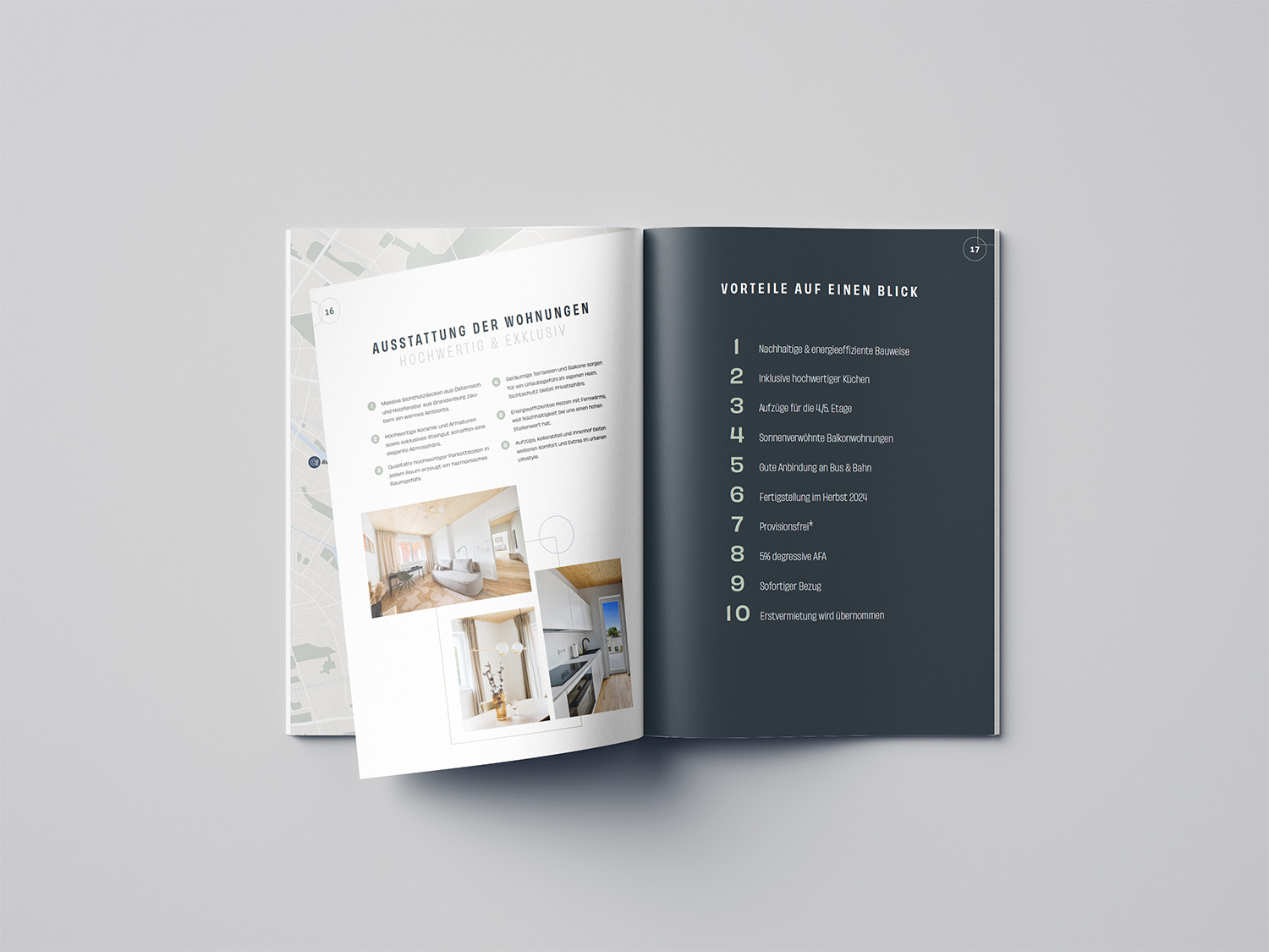 Nach einem Erstgespräch erarbeiten wir gemeinsam ein Konzept. Anschließend gestalten wir Ihre Broschüre individuell, mit hochwertigen Bildern, Grundrissen und Inhalten. Am Ende erhalten Sie eine druckfertige und digitale Version.